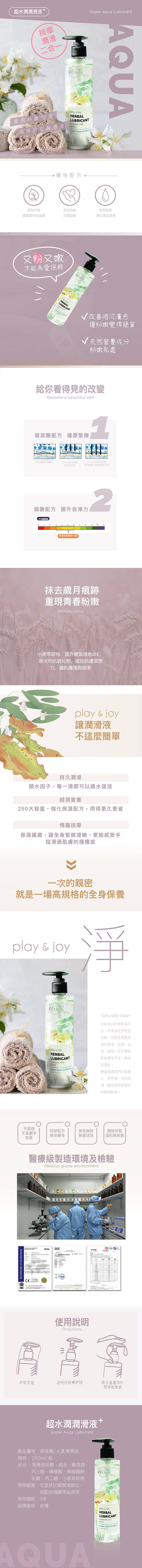 play & joy採用最先進科技,於無塵室中生產出最潔淨,最純粹的潤滑液,將讓你重新回到年輕時的感覺,將做愛當作一件快樂的事情,輕輕鬆鬆地享受夜晚的美。女性的私密部位是最敏感纖細的,play & joy特別考量私密部位的感覺開發出無色無味的潤滑液,經過上千人測試,較一般市面上的產品感覺更接近女性私密處分泌液。基底與潤滑成分以獨特的技術調和,讓你在濕潤歡暢時,不會有黏答答的不舒服,不會破壞了美好的感覺. play & joy 水潤型質地細緻,能帶領你體會真正做愛的樂趣!