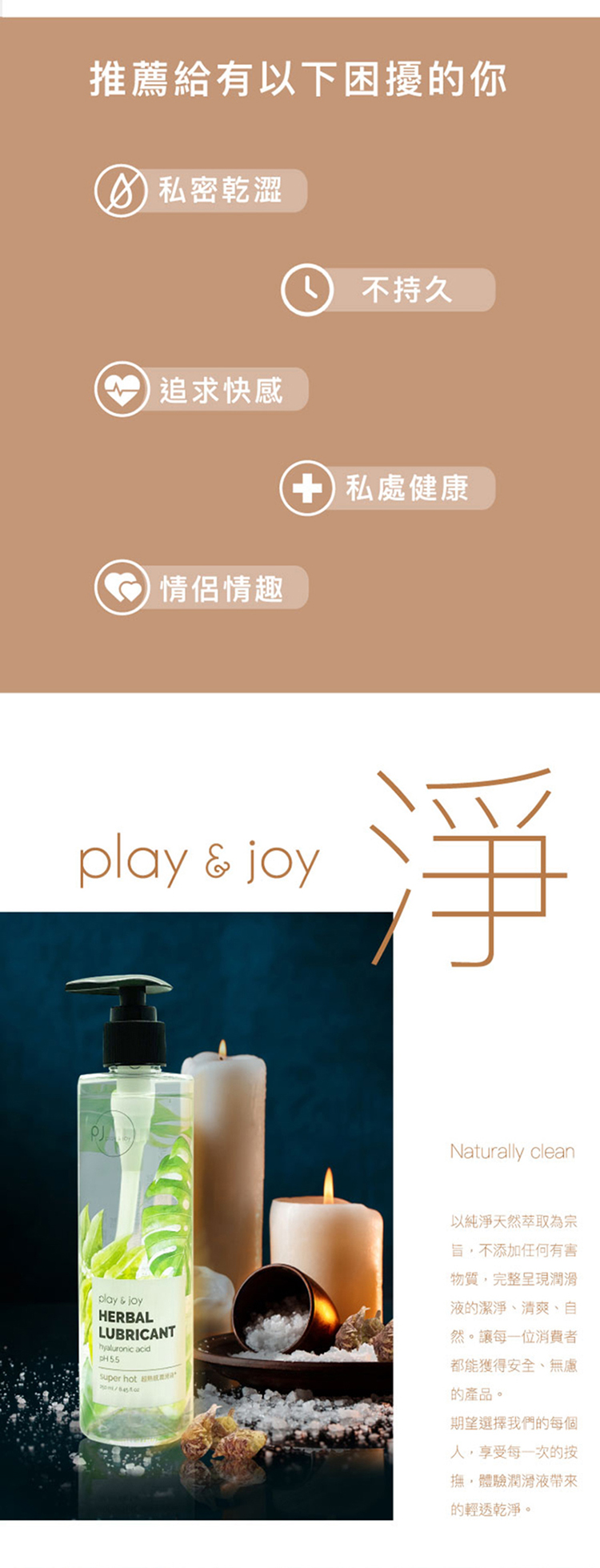 play & joy採用最先進科技,於無塵室中生產出最潔淨,最純粹的潤滑液,將讓你重新回到年輕時的感覺,將做愛當作一件快樂的事情,輕輕鬆鬆地享受夜晚的美。